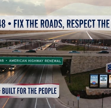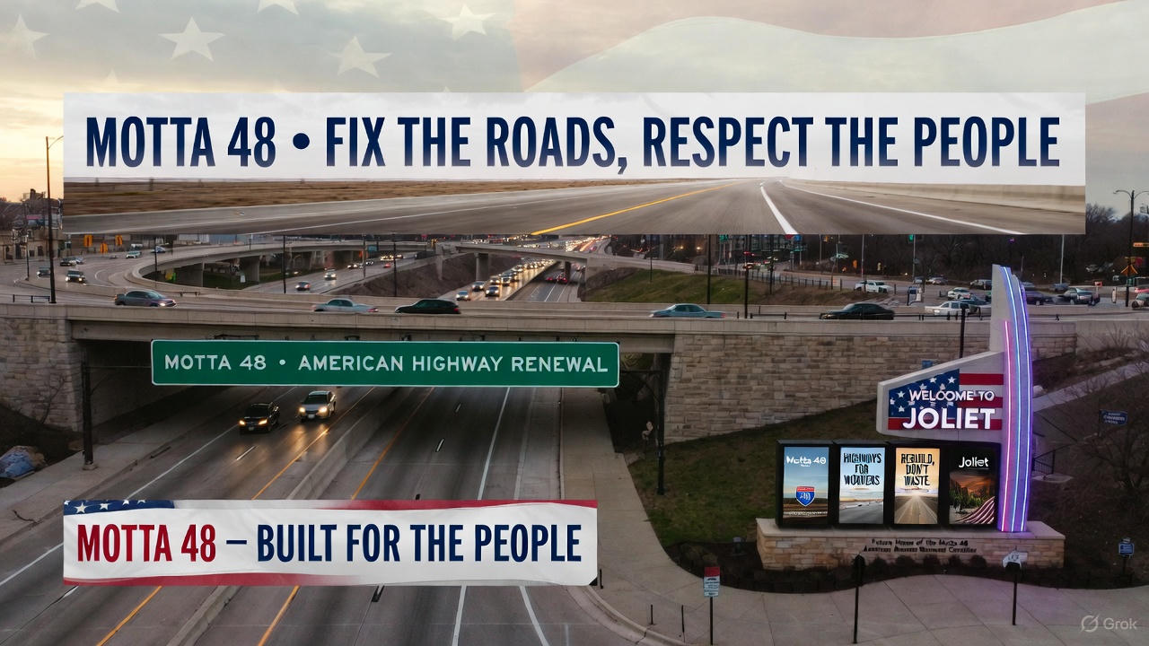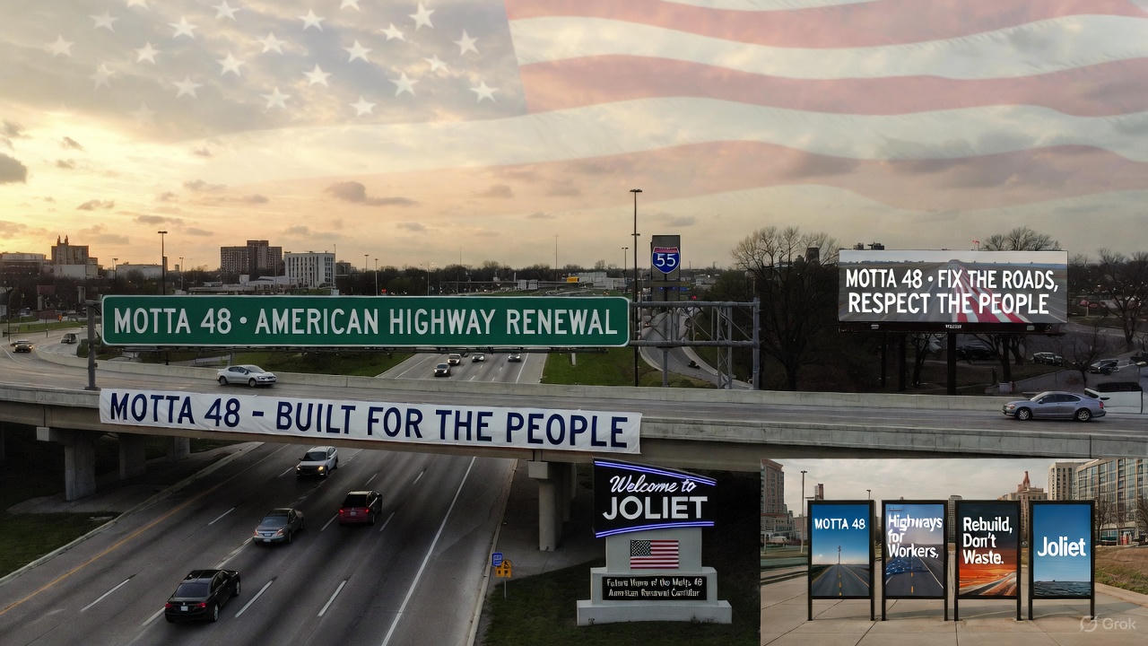 “Highway billboard beside an Illinois interstate, mock campaign-style design saying ‘MOTTA 48 • FIX THE ROADS, RESPECT THE PEOPLE’ with minimalistic graphic of a smooth highway and subtle US flag motif, photorealistic scene with cars on the road.”