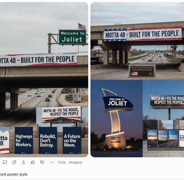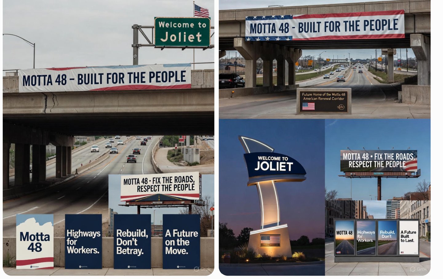 “Series of 4 vertical poster mockups on a city sidewalk display, each with a different slogan: ‘Motta 48’, ‘Highways for Workers’, ‘Rebuild, Don’t Waste’, ‘Joliet First’, clean graphic style, muted reds and blues, realistic reflections on glass.”