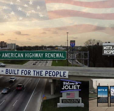 “Cinematic wide-angle aerial view of the I-55 and I-80 interchange near Joliet, Illinois, at golden hour, glowing headlights, subtle American flag pattern woven into the sky, large green overhead sign reading ‘MOTTA 48 • AMERICAN HIGHWAY RENEWAL’ in realistic DOT style.”